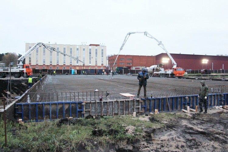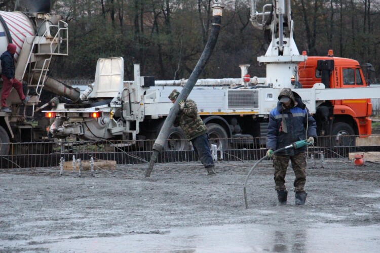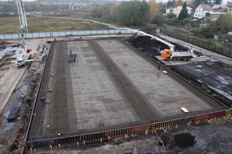 Скажем прямо – погода не была благосклонной к рабочим и строителям нашего подрядчика – ООО «Стройгарант». После удивительно теплой первой половины осени, оставшейся в нашей памяти как «бархатное бабье лето», пришло резкое похолодание со шквалистым ветром, продолжительными дождями и мокрым снегом. Тем не менее, в подаренные природой двое суток сухой, правда холодной погоды, с помощью двух бетононасосов в течение 16 часов непрерывной работы, строители сумели принять и уложить 86 «миксеров» бетона! Работа завершилась поздно ночью.